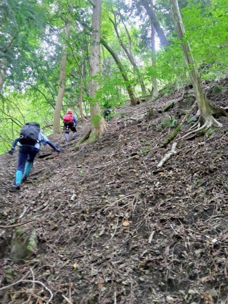 私は3度目の入渓でしたが、記憶が薄れていて、詰めの登山道までの急斜面がきつかったことさえ忘れていました。どうにか赤杭尾根の登山道に出たので、休憩と渓流シューズを履き替えて下山開始です。