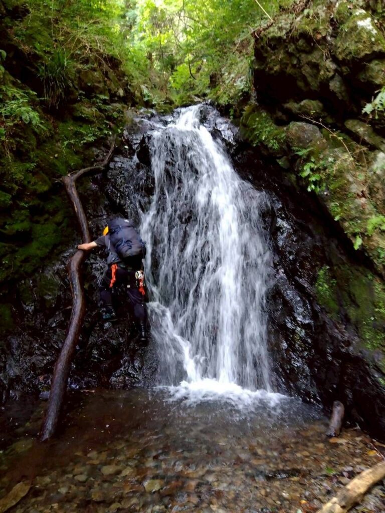 8mの魚止めの滝は、以前は水流の左右どちらも登れましたが、今はヌメっていたので右から巻きました。二俣や標高で現在地を確認しつつ、越えられる小滝が次々と出てきて、愉しい沢でした。熊に遭遇しないように、見通しの悪いところでは、ホイッスルを交代で吹き鳴らしつつ遡行しました。