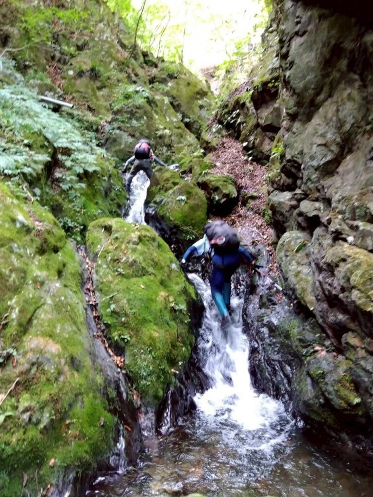 堰堤を4個越えた所で沢に降りて、身支度を整えました。行動時間が休憩込みで8時間程かかりそうなので、時間短縮のためロープは出さずに、滝は巻いて遡行しました。