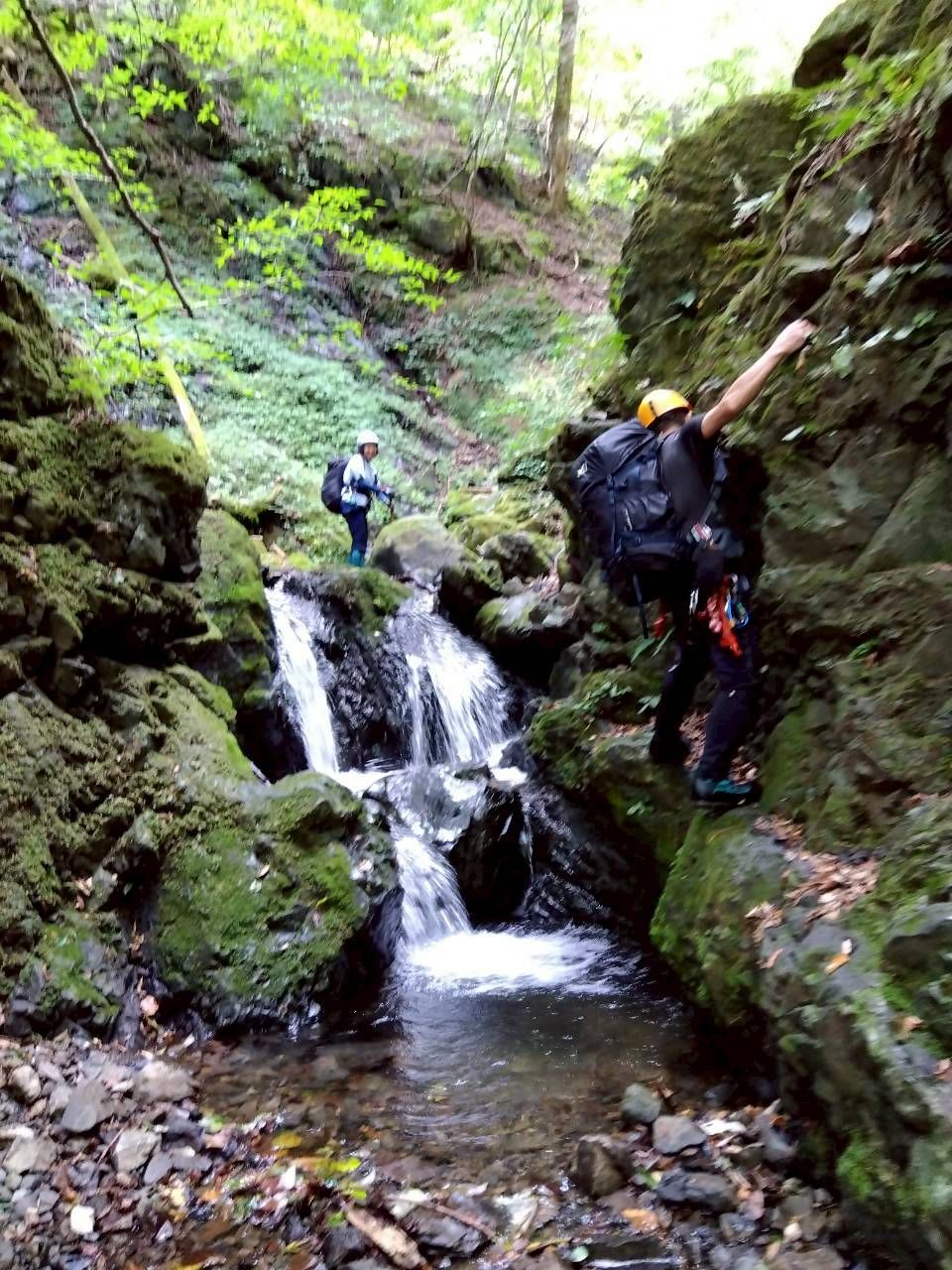 8mの魚止めの滝は、以前は水流の左右どちらも登れましたが、今はヌメっていたので右から巻きました。二俣や標高で現在地を確認しつつ、越えられる小滝が次々と出てきて、愉しい沢でした。熊に遭遇しないように、見通しの悪いところでは、ホイッスルを交代で吹き鳴らしつつ遡行しました。