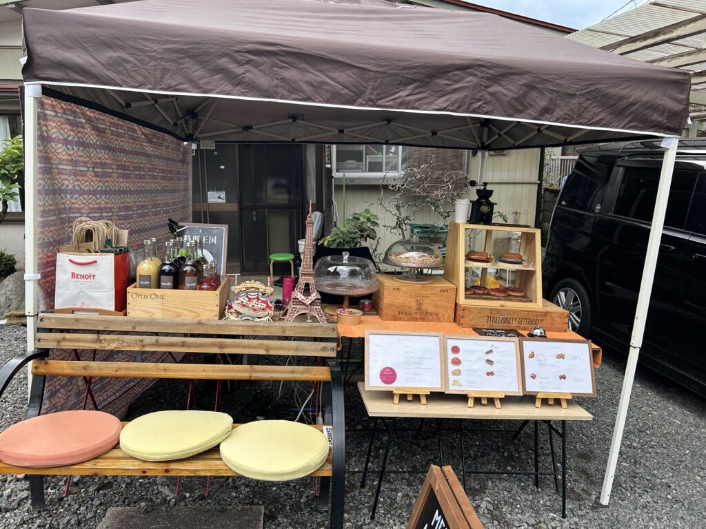 小峰ビジターセンターそばの民家の前にフランス菓子が並べてあり、思わず立ち寄りました。するといきなり土砂降りの雨が。幸いにも雨の中優雅にアップルパイとコーヒーで休憩することができました。本当はこのあと今熊山に登る予定でしたが、雨でゆっくり休憩したのと、また滑って転ぶ恐れがあるので、予定を変えて金剛の滝に向かうことに。