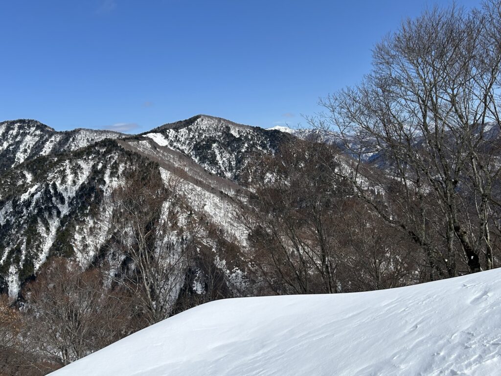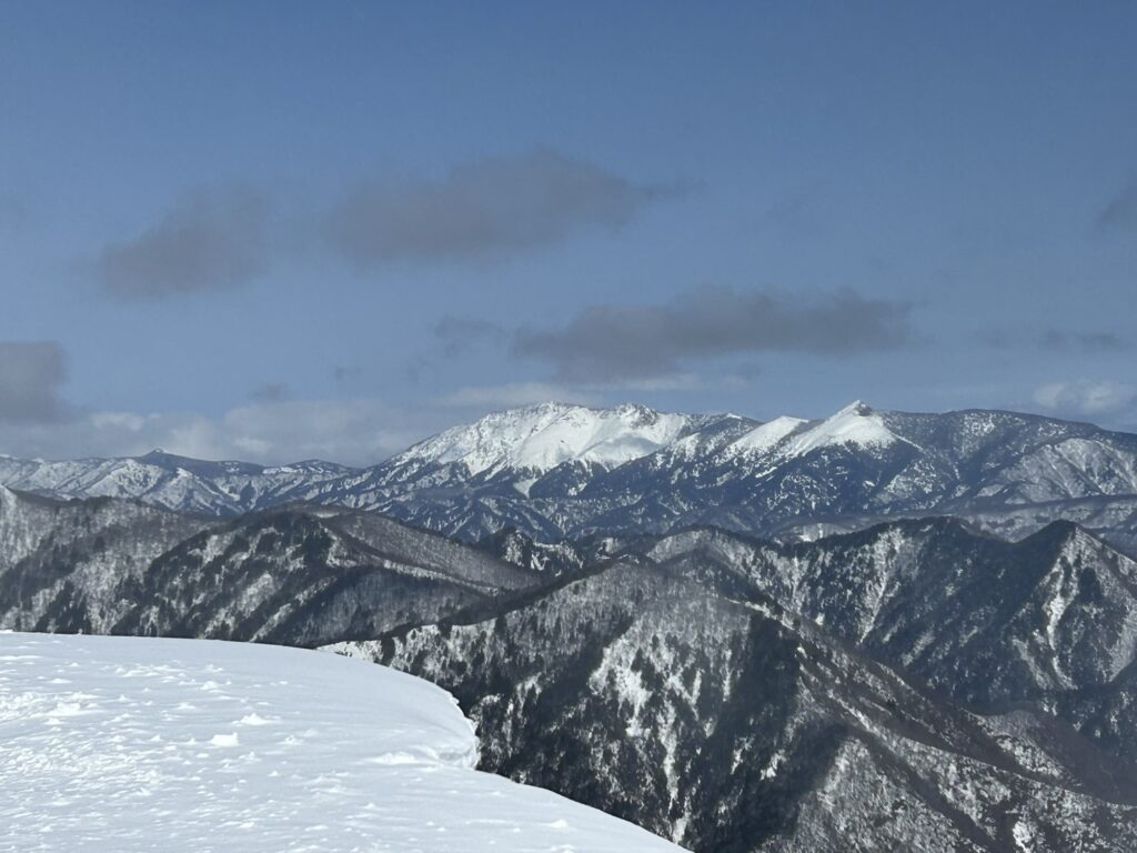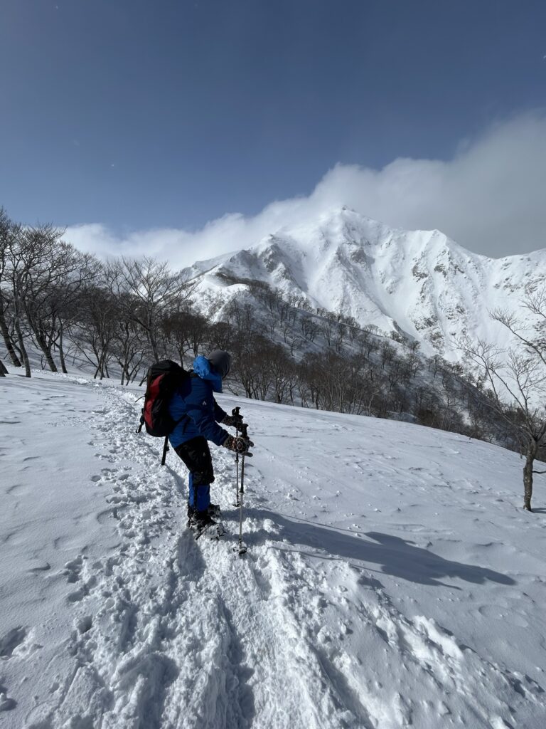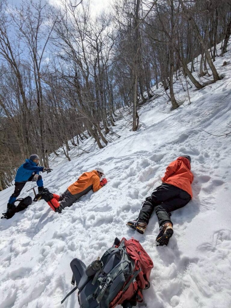 初日の訓練では西黒尾根の柔らかく歩きにくい雪の中をアイゼンを付けずにキックステップで登っていき、適当な斜面で滑りながらピッケルを使って体を止める滑落停止の練習を何度も行いました。先輩方はやはり動きも素早く、しっかりと止めていましたが、後輩二人は毎年の練習で慣れていくしかないようです。ワカンも練習しましたが、急な斜面を登るのは難しかったです。1000メートルあたりまで登って、上州武尊や白毛門などの山々をゆっくり眺めてから下山しました。
