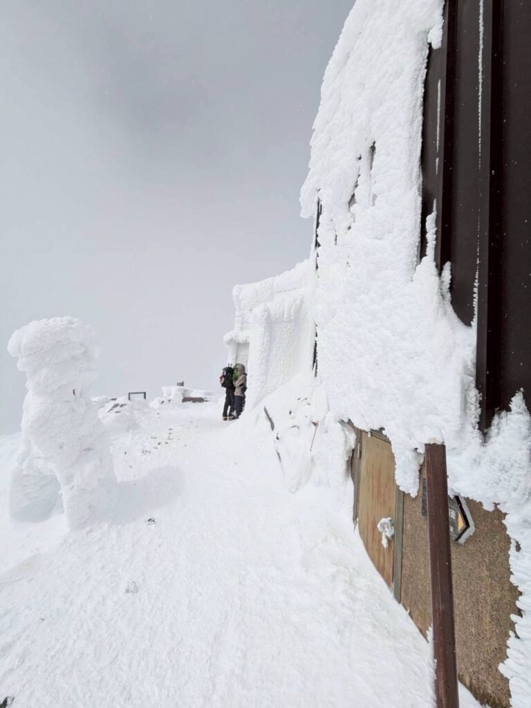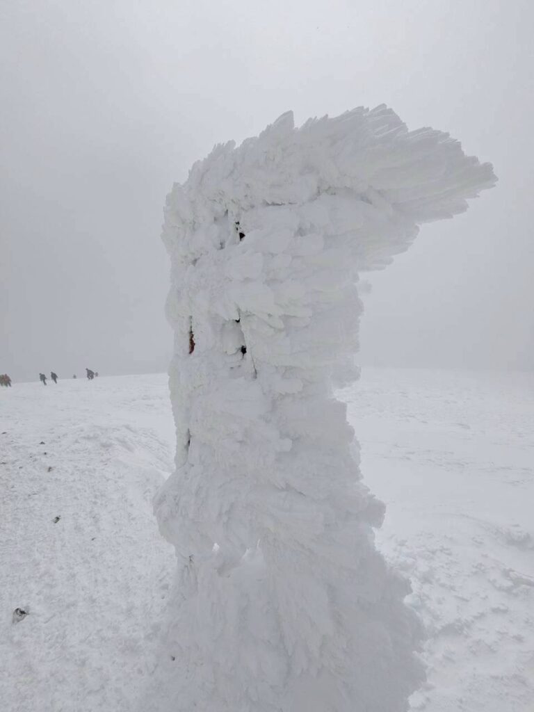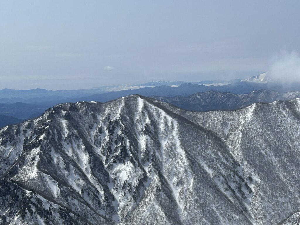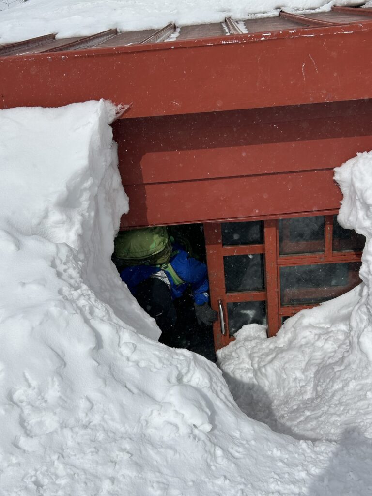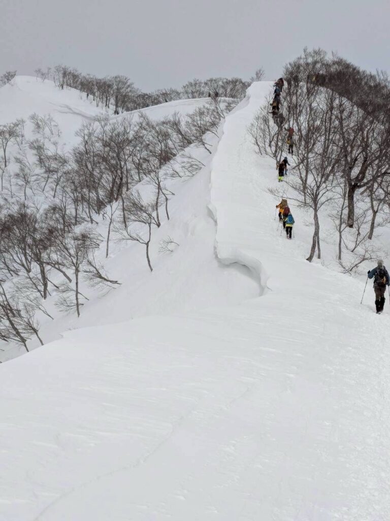 2日目は天神尾根から谷川岳に向かいました。最初の急登は人も多く、列になって順番に登って行きます。予報では晴天でしたが、実際は強風で、視界もたまに良くなるという感じでした。天狗の溜まり場あたりから引き返すグループもいましたが、なんとか行けるところまで行こうと登って行きました。帰りの電車の時間もあり、肩の小屋までで引き返すことに。あと少しでしたが、きっと景色も見れないだろうし、次回の楽しみにしようということにしました。下っていると徐々に天気は回復傾向に。登山あるあるだねと話しながらしばらく写真を撮ったり景色を楽しみました。後半の斜面を尻セードで滑り降り、無事今年の雪山訓練を終了しました。