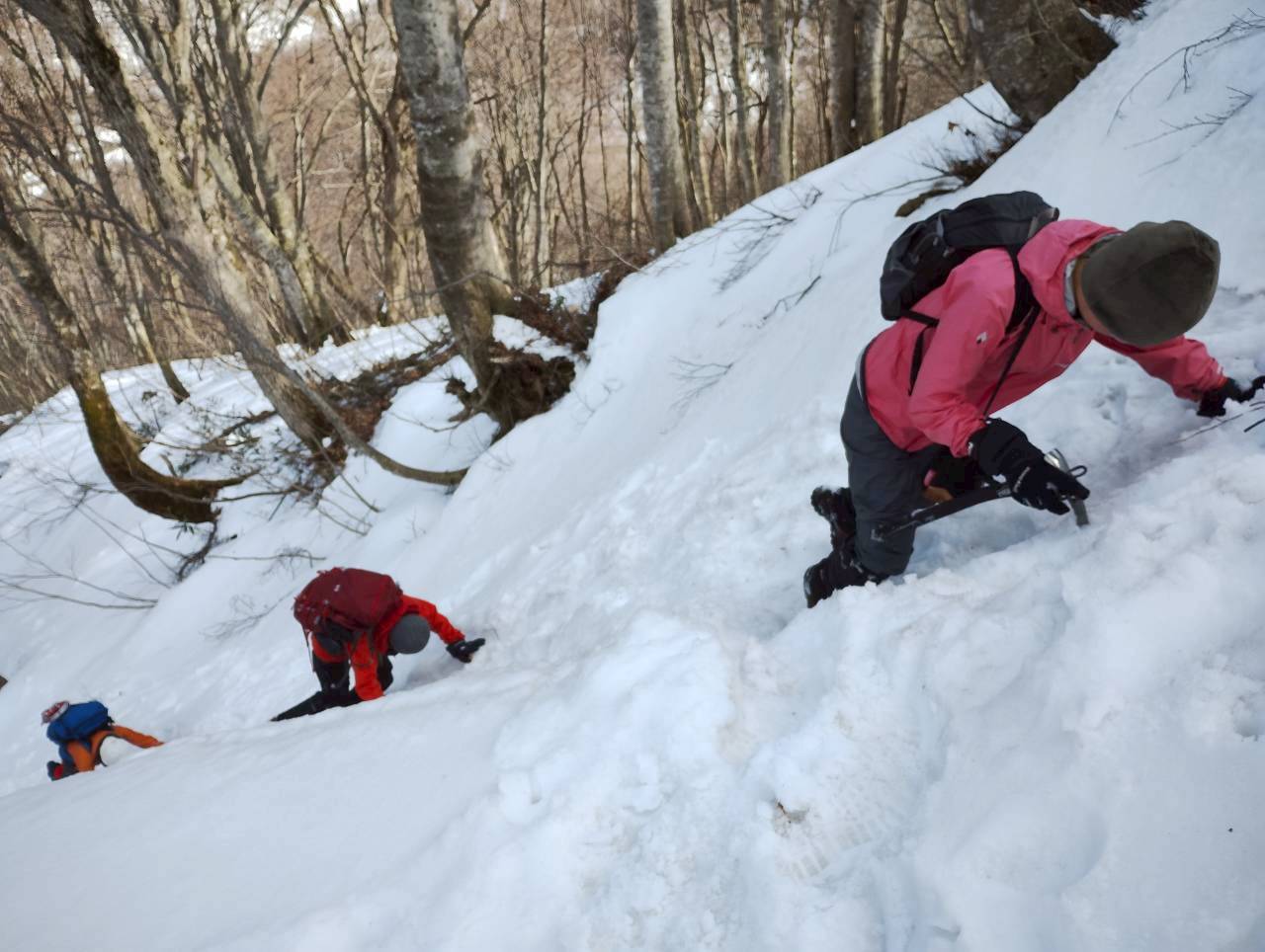 初日の訓練では西黒尾根の柔らかく歩きにくい雪の中をアイゼンを付けずにキックステップで登っていき、適当な斜面で滑りながらピッケルを使って体を止める滑落停止の練習を何度も行いました。先輩方はやはり動きも素早く、しっかりと止めていましたが、後輩二人は毎年の練習で慣れていくしかないようです。ワカンも練習しましたが、急な斜面を登るのは難しかったです。1000メートルあたりまで登って、上州武尊や白毛門などの山々をゆっくり眺めてから下山しました。
